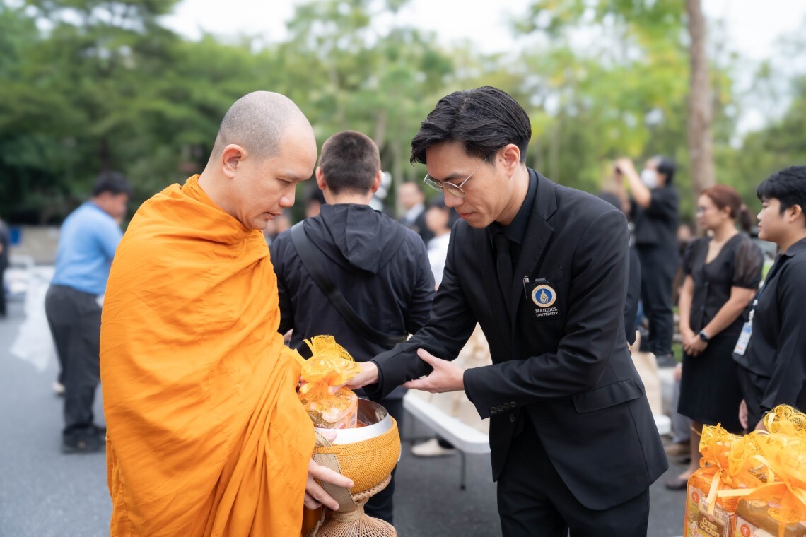 On November 7, 2025, Dr. Petch Sajjacholapunt, Deputy Dean for Administration and Human Resource of the Faculty of Information and Communication Technology, Mahidol University (ICT Mahidol), on behalf of the Dean, led the executive team, faculty members, and staff, to participate in the merit-making and alms-giving ceremony dedicated to Her Majesty Queen Sirikit The Queen Mother on the occasion of the 15th Day Remembrance at the front area of the Office of the President, Mahidol University, Salaya Campus.