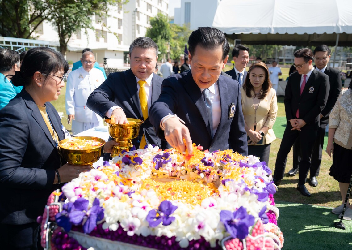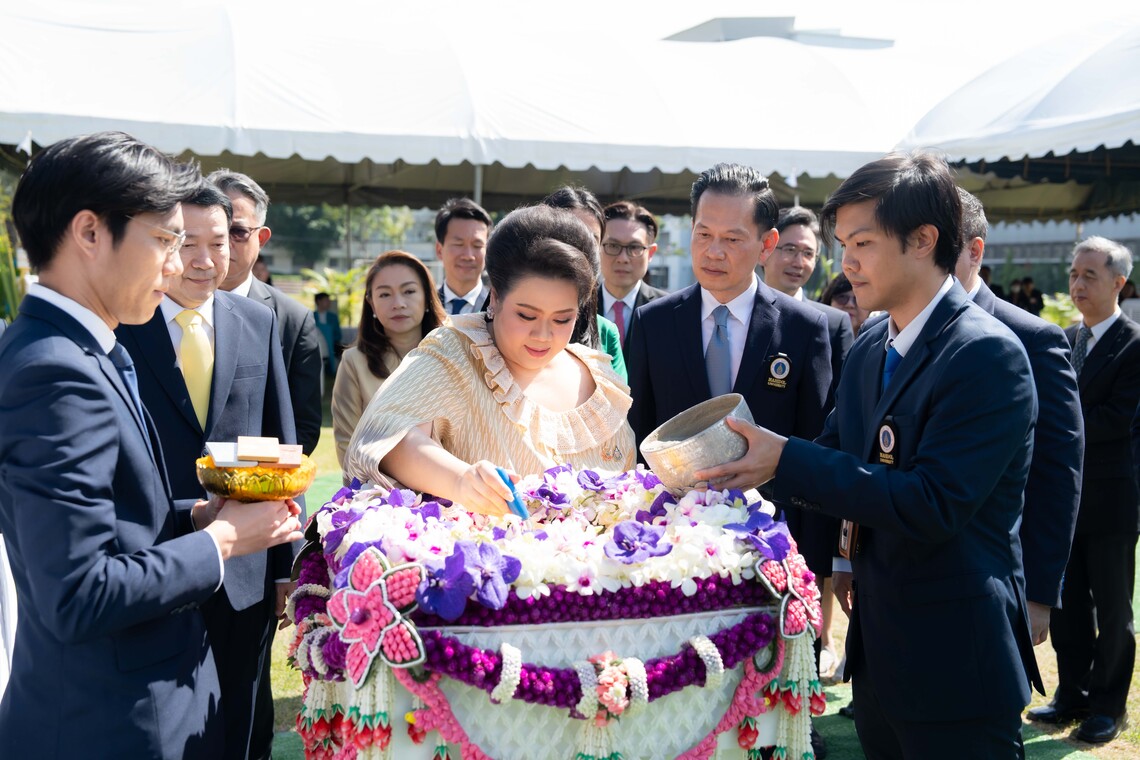 After the report was concluded, Ms. Supamas Isarabhakdi, presided over the Ground-Breaking Ceremony. She lit incense and candles at the offering table and placed the ceremonial incense sticks on the sacrificial table during the auspicious invocation ceremony. Subsequently, the Ground-Breaking ritual was performed, led by Royal Astrologer Chatchai Pin-ngern, Head of the Brahmin Astrology, Bureau of the Royal Household. Following the ceremony, executives and distinguished guests participated in scattering flowers over the foundation stone.