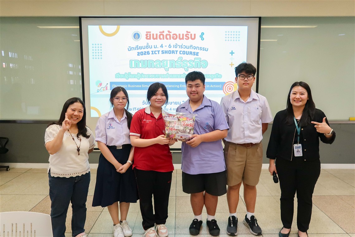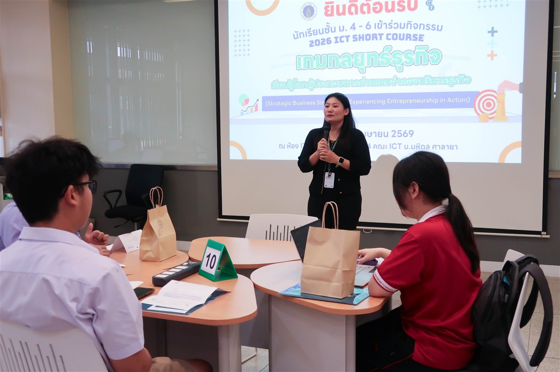 On April 3, 2026, the Faculty of Information and Communication Technology, Mahidol University (ICT Mahidol), organized the 2026 ICT Mahidol Short Course on “Strategic Business Simulation: Experiencing Entrepreneurship in Action.” The session was conducted by Asst. Prof. Dr. Srisupa Palakvangsa Na Ayudhya and Dr. Pattaraporn Sangaroonsilp, instructors from the Computer Science Academic Group and members of the Software Engineering and Business Analytics Research Clusters (SEBA). The course introduced participants to strategic business management through a Macro Business Simulation Game, which replicates real-world economic environments, market competition, strategic planning, pricing decisions, investment strategies, and resource management. The session was attended by a total of 60 high school students and was held in Rooms IT405 and IT406, 4th floor, ICT Building, Mahidol University, Salaya Campus.