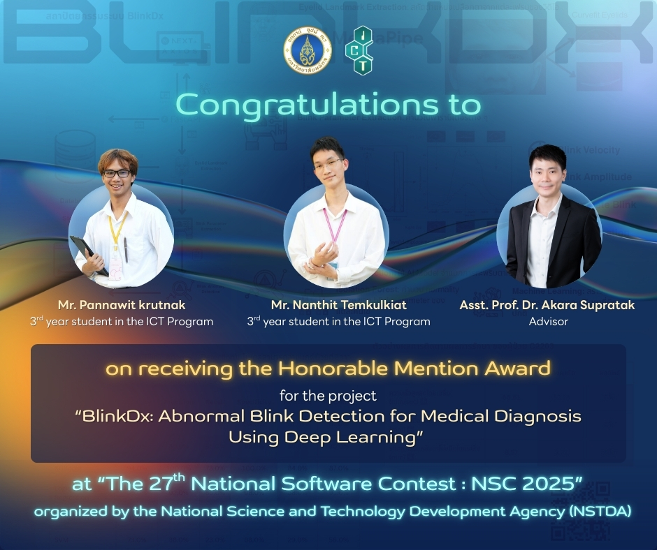 The Faculty of Information and Communication Technology, Mahidol University (ICT Mahidol), would like to extend its heartfelt congratulations to Mr.Pannawit krutnak and Mr.Nanthit Temkulkiat, third-year students in the Bachelor of Science in Information and Communication Technology (ICT International Program), on receiving the Honorable Mention Award at the 27th National Software Contest (NSC 2025), in the category of Software for Healthcare, People with Disabilities, and the Elderly, at the university student level. Their winning project, “BlinkDx: Abnormal Blink Detection for Medical Diagnosis Using Deep Learning,” was supervised by Asst. Prof. Dr. Akara Supratak. The results were officially announced on August 25, 2025.