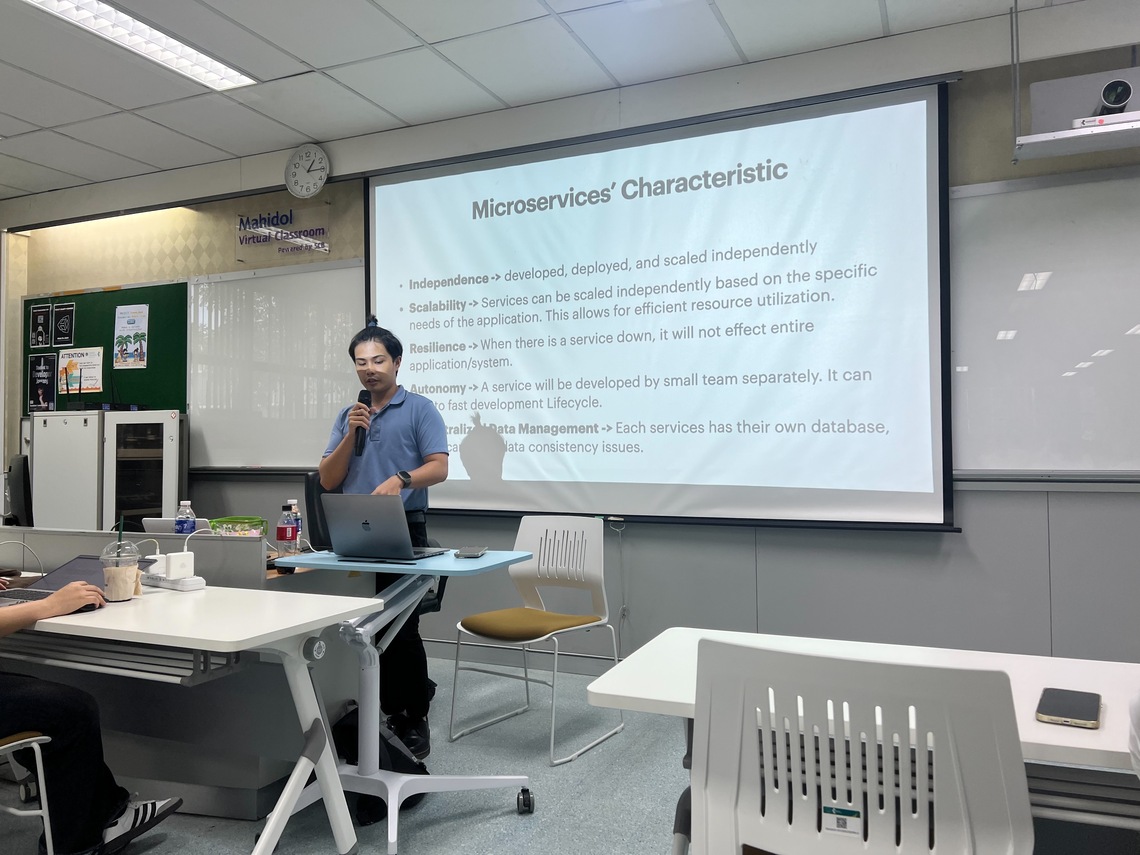 On May 1, 2024 – the Faculty of Information and Communication Technology, Mahidol University (ICT Mahidol), led by Dr. Wudhichart Sawangphol, Assistant Dean for Research, organized a special talk on “Introduction to Microservices and Web 3.0” for the students in both B.Sc. in Information and Communication Technology (ICT International Proram), and B.Sc. in Digital Science and Technology (DST Thai Program). On this occasion, Mr. Matchatta Toyaem, Microservice Developer, IBM Thailand Co., Ltd. (ICT Alumnus, Batch 15), served as the guest speaker. He shared his knowledge about Microservices, a software architecture that can divide applications into small units, and Web 3.0, the era of the Internet that focuses more on providing user privacy, utilizing blockchain technology, and Artificial Intelligence (AI). The session took place in Room IT204, 2nd floor, the Faculty of ICT, Mahidol University, Salaya.