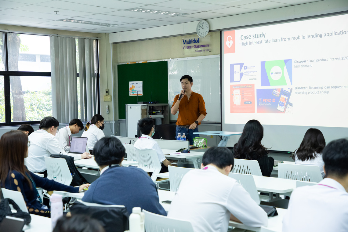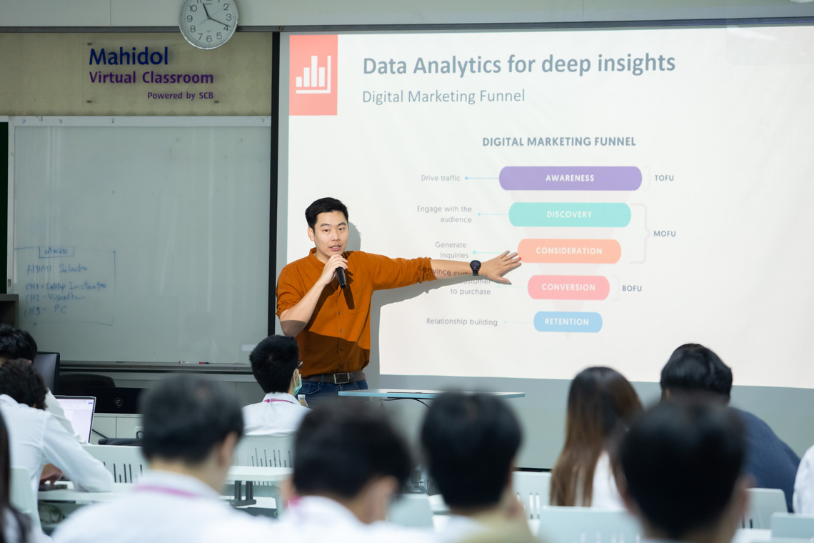 On January 24, 2024, the Faculty of Information and Communication Technology, Mahidol University (ICT Mahidol), led by Assoc. Prof. Dr. Sudsanguan Ngamsuriyaroj, Advisor to the Dean, and Dr. Tipajin Thaipisutikul, Assistant Dean for Academic Services and Technology Transfer, who are instructors of the course ITDS201 Industry Problems and Experiences 2, organized a special talk on “Deciphering Customer Behavior: Leveraging Data Analytics for Deep Insights” for the 2nd year students of B.Sc. in Digital Science and Technology (DST Thai Program). On this occasion, Mr. Nantapol Rattanapolwachirawadee (ICT Alumnus #4), Innovation Product Manager, KASIKORN Business-Technology Group (KBTG), served as the speaker. He shared his knowledge on studying customer behavior and utilizing data analytics for in-depth insights. The session took place in Room IT204, the Faculty of ICT, Mahidol University, Salaya