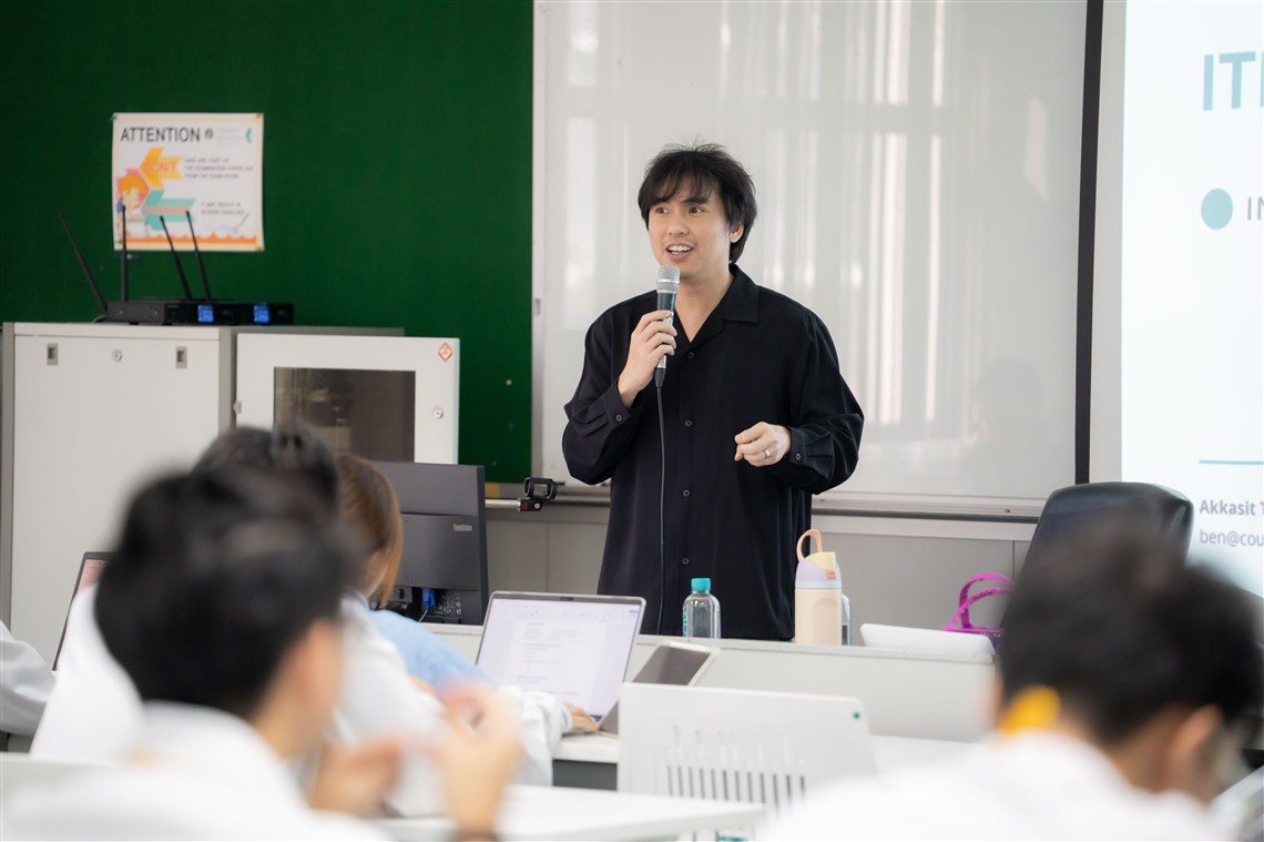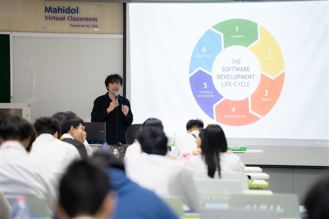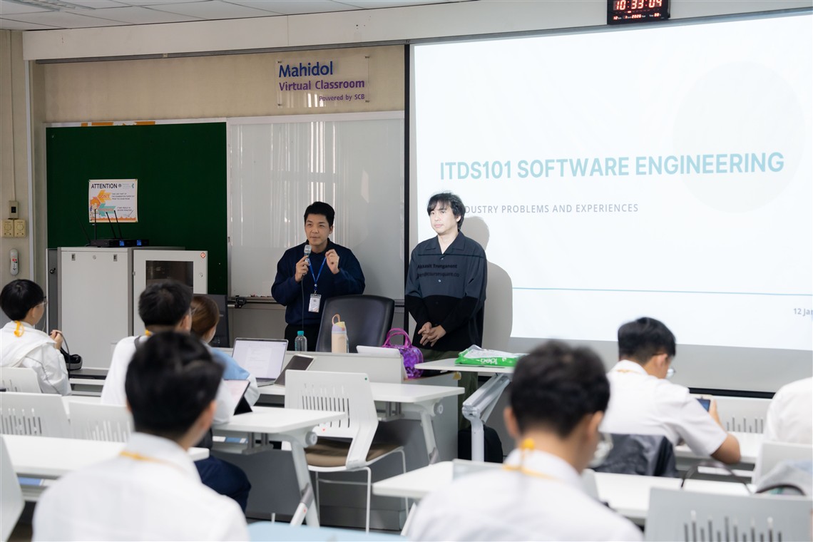 On January 12, 2026, the Faculty of Information and Communication Technology, Mahidol University (ICT Mahidol), led by Asst. Prof. Dr. Chaiyong Ragkhitwetsagul, an instructor in the Computer Science Academic Group and the Software Engineering and Business Analytics Research Clusters (SEBA), organized a special lecture on “Software Engineering.” The lecture was held as part of the course ITDS101 Industry Problems and Experiences 1. The session was honored by Mr. Akkasit Trunganont, Chief Technology Officer of CourseSquare and an ICT Mahidol alumnus (Batch 1), who delivered a lecture on software systems to first-year students enrolled in the Bachelor of Science Program in Digital Science and Technology (DST Thai Program). The lecture took place in Room IT204, 2nd Floor, ICT Building, Mahidol University, Salaya Campus.