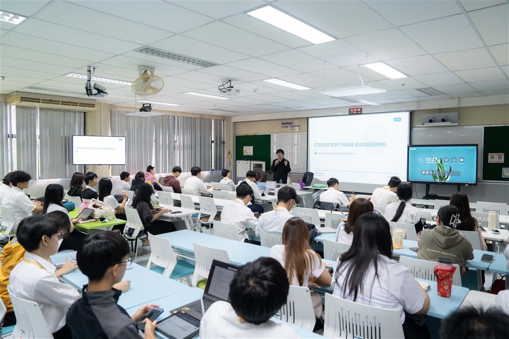 On January 12, 2026, the Faculty of Information and Communication Technology, Mahidol University (ICT Mahidol), led by Asst. Prof. Dr. Chaiyong Ragkhitwetsagul, an instructor in the Computer Science Academic Group and the Software Engineering and Business Analytics Research Clusters (SEBA), organized a special lecture on “Software Engineering.” The lecture was held as part of the course ITDS101 Industry Problems and Experiences 1. The session was honored by Mr. Akkasit Trunganont, Chief Technology Officer of CourseSquare and an ICT Mahidol alumnus (Batch 1), who delivered a lecture on software systems to first-year students enrolled in the Bachelor of Science Program in Digital Science and Technology (DST Thai Program). The lecture took place in Room IT204, 2nd Floor, ICT Building, Mahidol University, Salaya Campus.