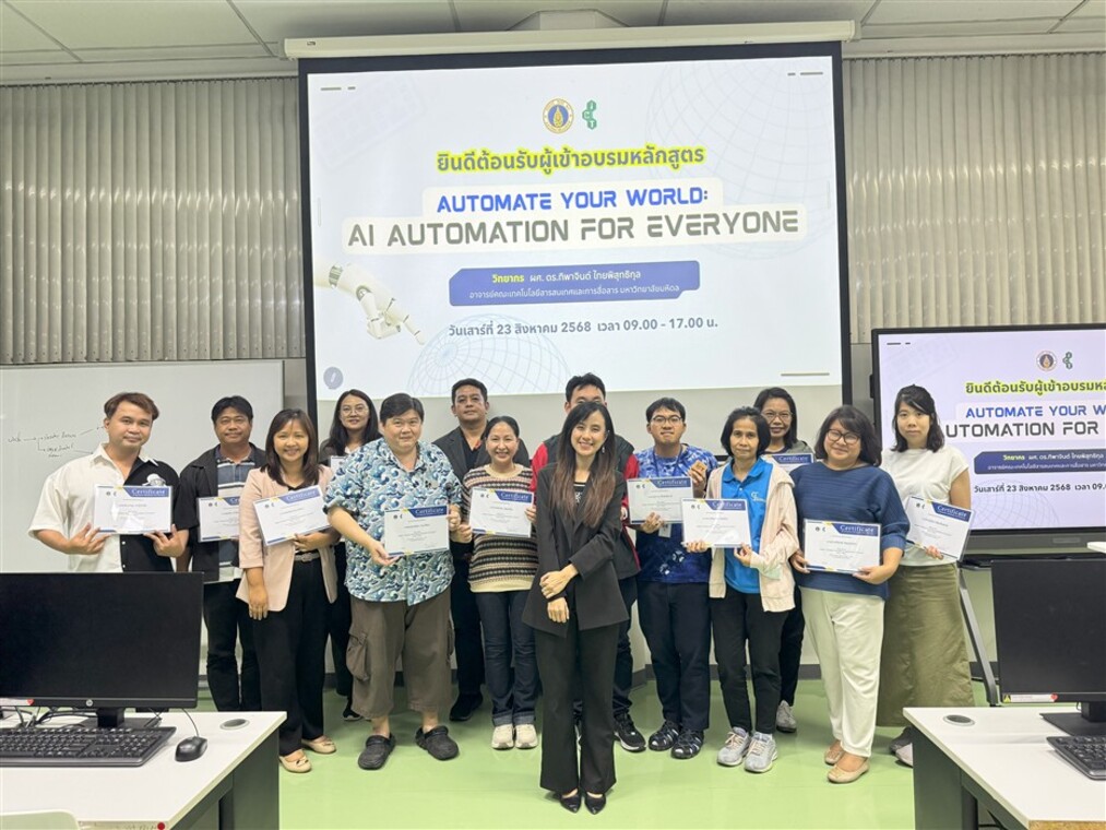วันที่ 23 สิงหาคม 2568 คณะเทคโนโลยีสารสนเทศและการสื่อสาร มหาวิทยาลัยมหิดล (ICT Mahidol) จัดอบรมหลักสูตร “Automate Your World: AI Automation for Everyone” เสริมทักษะการทำงานยุคใหม่ด้วย AI และระบบอัตโนมัติ โดยได้รับเกียรติจาก ผศ.ดร.ทิพาจินต์ ไทยพิสุทธิกุล ผู้ช่วยคณบดีฝ่ายบริการวิชาการและถ่ายทอดเทคโนโลยี เป็นวิทยากรบรรยายและถ่ายทอดความรู้ ให้แก่ผู้สนใจทั่วไป ณ ห้องปฏิบัติการคอมพิวเตอร์ IT103 คณะ ICT มหาวิทยาลัยมหิดล ศาลายา