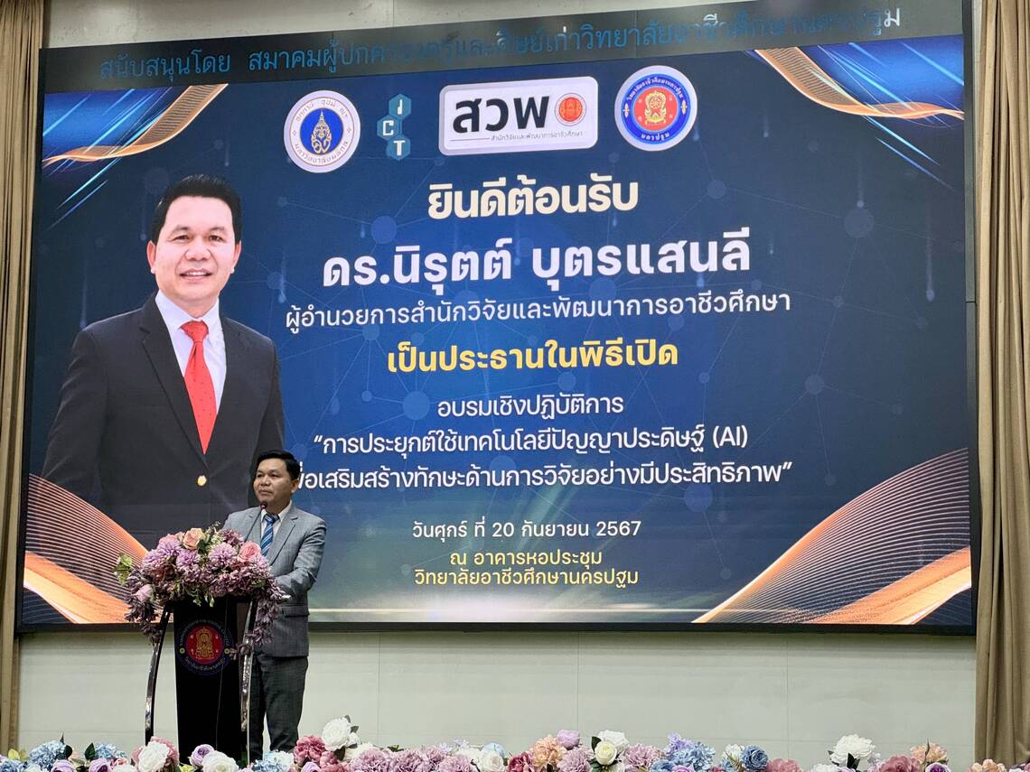 โครงการอบรม “การประยุกต์ใช้เทคโนโลยีปัญญาประดิษฐ์ (AI) เพื่อเสริมสร้างทักษะด้านการวิจัยอย่างมีประสิทธิภาพ สำหรับสำนักวิจัยและพัฒนาการอาชีวศึกษา” เป็นการอบรมภายใต้โครงการ Customized Training โดยมีวัตถุประสงค์เพื่อยกระดับคุณภาพของบุคลากรด้านการวิจัยและผลงานวิจัยของอาชีวศึกษา ผ่านการอบรมด้านการใช้เครื่องมือ AI ที่เกี่ยวข้องกับการทำวิจัยในปัจจุบัน เช่น การใช้ AI ในการช่วยค้นหาปัญหาที่น่าสนใจ พร้อมช่วยวิเคราะห์แนวทางและวิธีการวิจัย เครื่องมือ AI ที่ช่วยในการค้นหางานวิจัยและบทความที่เกี่ยวข้อง และการใช้ AI ในการจัดการข้อมูลอ้างอิง เป็นต้น ซึ่งจะช่วยให้ผู้เข้าอบรมสามารถนำองค์ความรู้จากการอบรมครั้งนี้ไปประยุกต์ใช้ร่วมกับการทำงานวิจัยของของตนเองได้อย่างมีประสิทธิภาพยิ่งขึ้น