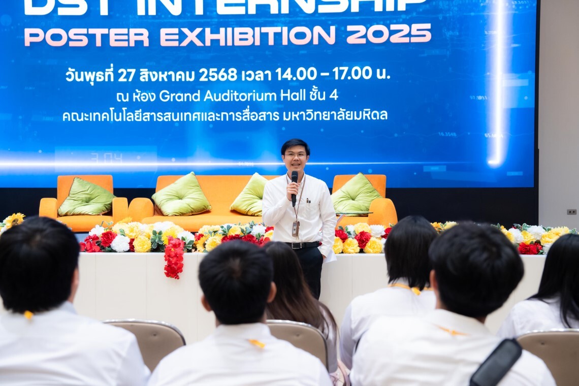 วันที่ 27 สิงหาคม 2568 คณะเทคโนโลยีสารสนเทศและการสื่อสาร มหาวิทยาลัยมหิดล (ICT Mahidol) จัดกิจกรรม “DST Internship Exhibition 2025” ให้แก่นักศึกษาชั้นปีที่ 3 หลักสูตรวิทยาศาสตรบัณฑิตสาขาวิชาวิทยาการและเทคโนโลยีดิจิทัล (DST หลักสูตรไทย) โดยได้รับเกียรติจาก ผศ. ดร.ธนพล นรเสฏฐ์ ผู้ช่วยคณบดีฝ่ายการศึกษา กล่าวเปิดกิจกรรม ณ ห้อง Grand Auditorium Hall ชั้น 4 อาคาร ICT มหาวิทยาลัยมหิดล วิทยาเขตศาลายา