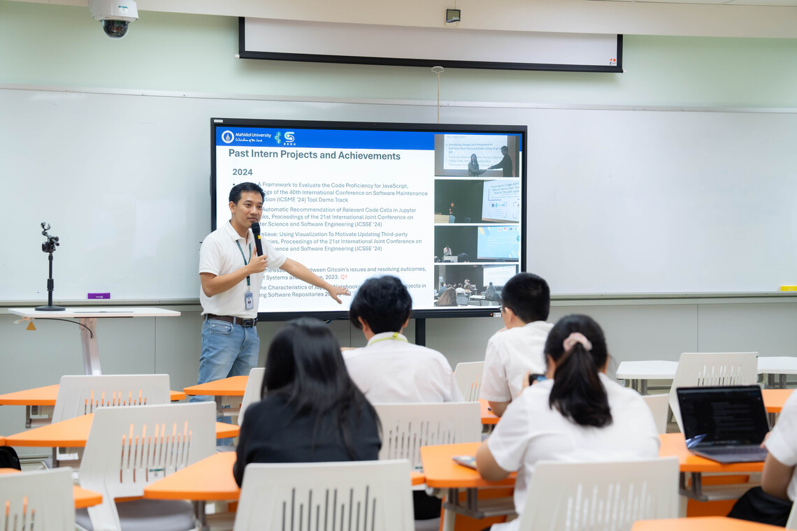 วันที่ 12 พฤศจิกายน 2567 คณะเทคโนโลยีสารสนเทศและการสื่อสาร มหาวิทยาลัยมหิดล (ICT Mahidol) นำโดย ผศ.ดร. มรกต เชิดเกียรติกุล พร้อมด้วย ผศ.ดร. ชัยยงค์ รักขิตเวชสกุล และ ดร. ภัทรพร แสงอรุณศิลป์ อาจารย์ประจำกลุ่มวิชาวิทยาการคอมพิวเตอร์ และกลุ่มวิจัยวิศวกรรมซอฟต์แวร์และการวิเคราะห์ธุรกิจ (Software Engineering and Business Analytics Research Clusters (SEBA)) จัดกิจกรรม “Information Session: Abroad Internship, Japan (Round 2: NAIST)” เพื่อแนะนำข้อมูลโครงการแลกเปลี่ยน ณ NARA Institute of Science and Technology (NAIST) ประเทศญี่ปุ่น และภาพรวมของการฝึกงานด้าน ICT พร้อมชี้แจงรายละเอียดเกี่ยวกับเกณฑ์การสมัคร ให้แก่นักศึกษาหลักสูตรวิทยาศาสตรบัณฑิต สาขาวิชาเทคโนโลยีสารสนเทศและการสื่อสาร (ICT หลักสูตรนานาชาติ) จำนวน 21 คน ณ ห้อง IT331 ชั้น 3 คณะ ICT มหาวิทยาลัยมหิดล ศาลายา