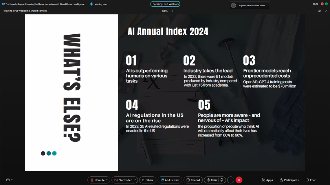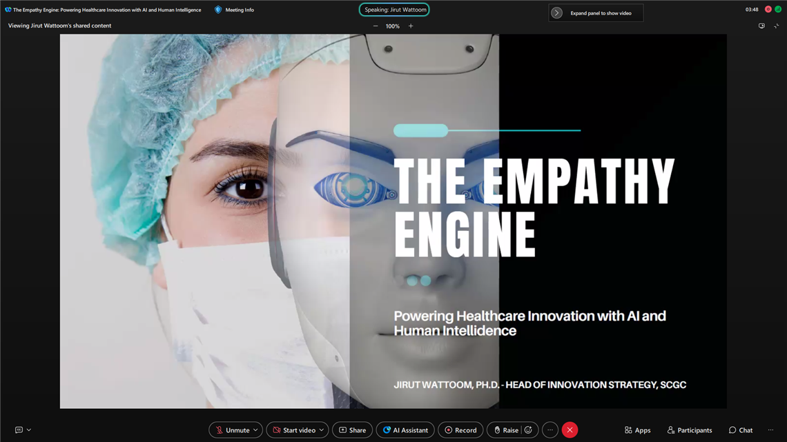 วันที่ 3 กันยายน 2568 คณะเทคโนโลยีสารสนเทศการสื่อสาร มหาวิทยาลัยมหิดล (ICT Mahidol) ร่วมกับสถาบันวิศวกรรมปัญญาประดิษฐ์ (AI Engineering Institute: AIEI) จัดงานสัมมนาวิชาการออนไลน์ “Smart AI, Smart Health, Smarter You” หัวข้อ “The Empathy Engine: Powering Healthcare Innovation with AI and Human Intelligence” โดยได้รับเกียรติจาก คุณจิรุตถ์ วัดตูม Head of Innovation and Portfolio Management, SCG Chemicals Public Company Limited (SCGC) เป็นวิทยากรบรรยายถ่ายทอดองค์ความรู้และประสบการณ์ด้านเทคโนโลยีแห่งอนาคต ให้แก่นักศึกษา คณาจารย์ และบุคลากร ในรูปแบบออนไลน์ ผ่านระบบ Webex Meetings